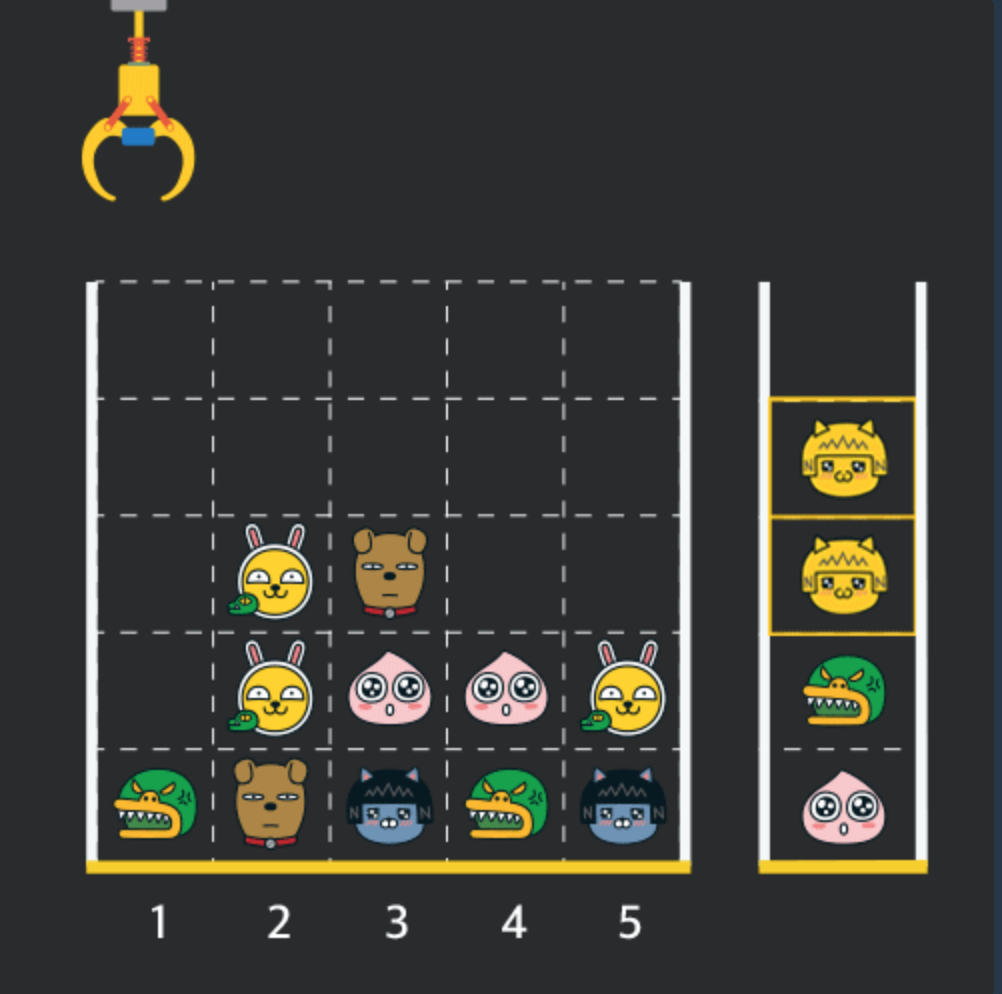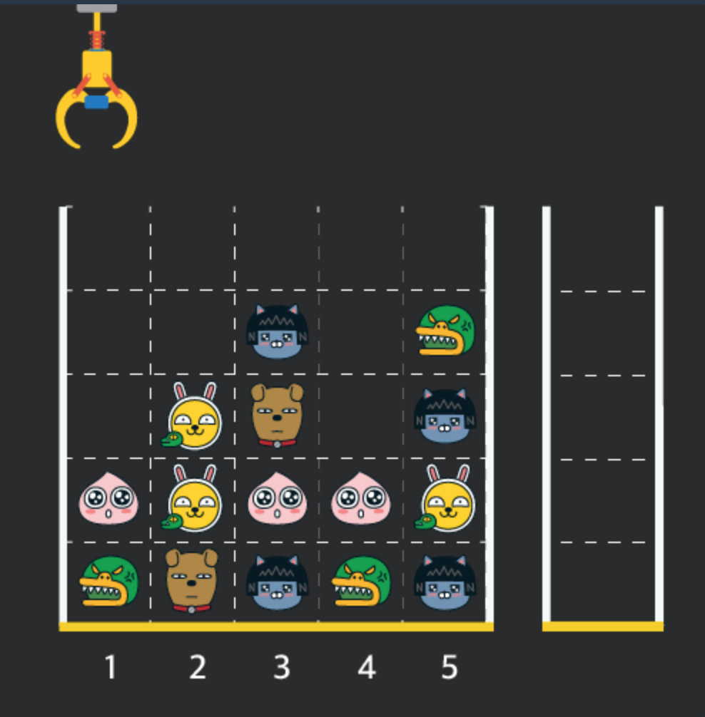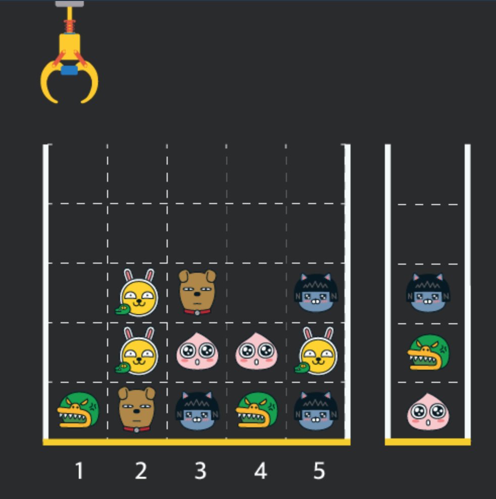게임 화면은 1 x 1 크기의 칸들로 이루어진 N x N 크기의 정사각 격자이며 위쪽에는 크레인이 있고 오른쪽에는 바구니가 있습니다. (위 그림은 5 x 5 크기의 예시입니다). 각 격자 칸에는 다양한 인형이 들어 있으며 인형이 없는 칸은 빈칸입니다. 모든 인형은 1 x 1 크기의 격자 한 칸을 차지하며 격자의 가장 아래 칸부터 차곡차곡 쌓여 있습니다. 게임 사용자는 크레인을 좌우로 움직여서 멈춘 위치에서 가장 위에 있는 인형을 집어 올릴 수 있습니다. 집어 올린 인형은 바구니에 쌓이게 되는 데, 이때 바구니의 가장 아래 칸부터 인형이 순서대로 쌓이게 됩니다. 다음 그림은 [1번, 5번, 3번] 위치에서 순서대로 인형을 집어 올려 바구니에 담은 모습입니다.