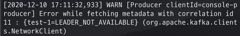 kafka LEADER_NOT_AVAILABLE 에러 발생 시 메세지를 생성할때 LEADER_NOT_AVAILABLE 에러가 발생하면서 안될 경우 ex) WARN Error while fetching metadata with correlation id 0 : {topic_name=LEADER_NOT_AVAILABLE} (org.apache.afka.clients.Ne