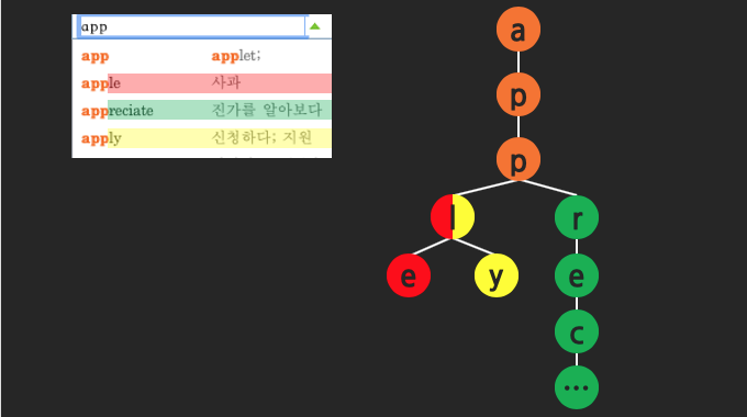 그림 [1]을 보면 app을 검색했을 때 3개의 문자열(apple, appreciate, apply)이 나오게 되는데 문자열을 저장하는 트라이 자료구조를 보면 위와 같다.