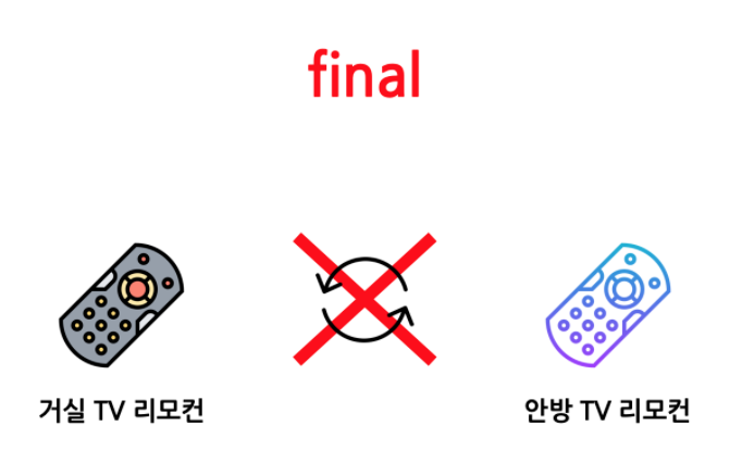 그림 [2]에서 final 키워드를 사용하면 거실에 있는 TV 리모컨이 안방에 있는 TV 리모컨으로 조작할 수 없다.