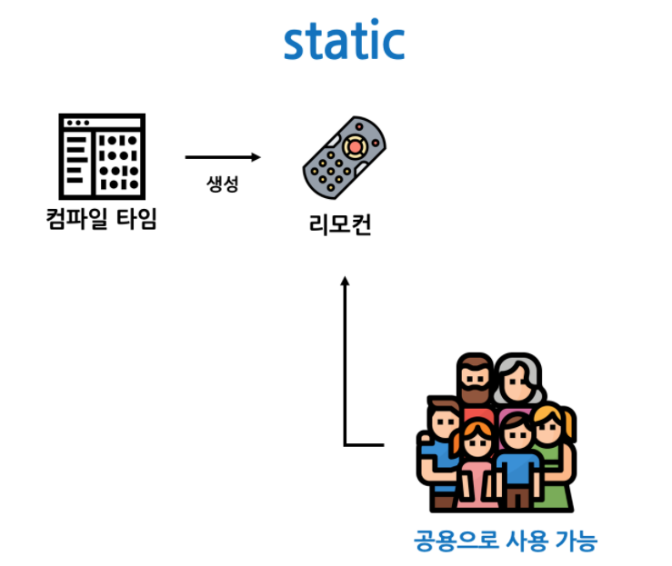 그림 [1]에서 static 키워드를 사용하면 컴파일 타임에 리모컨을 생성하여, 하루가 지나도 같은 리모컨을 가족들이 공통으로 사용할 수 있다.