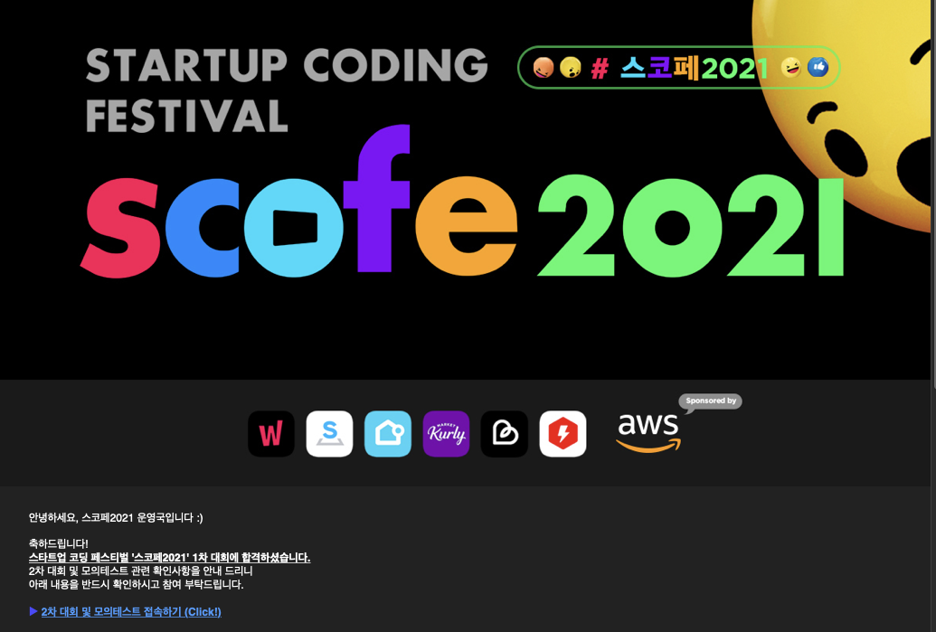떨어진 줄 알았는데 며칠 뒤에 위와 같이 합격 메일을 받게 되었습니다. 😭 이제 2차 대회가 남았는데 저는 1차도 어려워서 2차에 올라간 것만으로도 충분히 만족하고 있습니다.